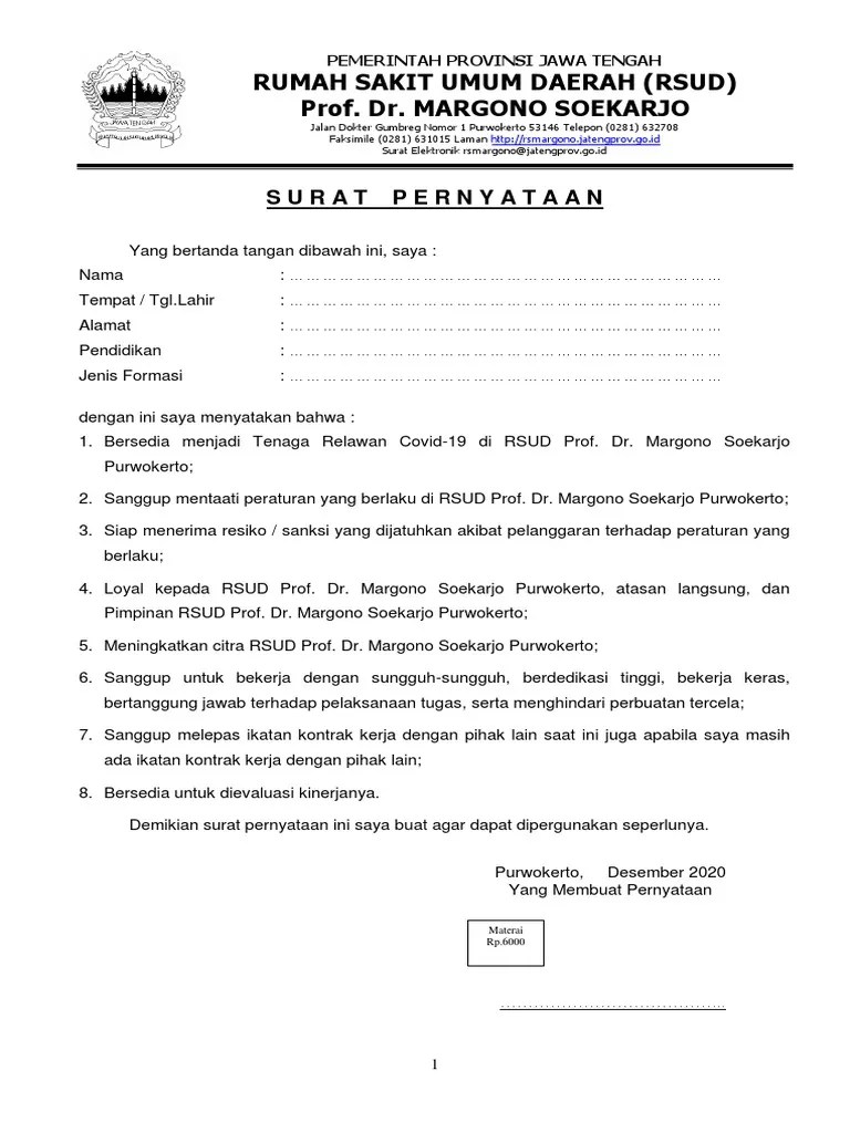 Madrasah/sekolah/ptkn sesuai wilayah tempat mengajar dan berdasarkan peta. Bersedia untuk melaksanakan kewajiban sebagai relawan contract tracer (pelacak . Bersedia bekerja di ruang isolasi, bekerja shif, bersedia digaji rp. Scan surat pernyataan (bermaterai 6000):. Demikian surat pernyataan ini saya buat dalam keadaan sadar dan tanpa .