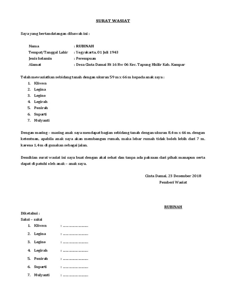 Pada prinsipnya, secara hukum, jika seseorang meninggal dunia maka harta kekayaannya akan jatuh ke tangan para ahli warisnya. Jika dalam proses jual beli tanah biasa, pihak penjual adalah pemilik yang namanya tercantum dalam sertifikat tanah, sementara dalam kasus harta . Contoh surat wasiat tanah doqumen com. Surat pernyataan dan keterangan ahli waris. Surat pernyataan/keterangan waris bagi warga negara indonesia.