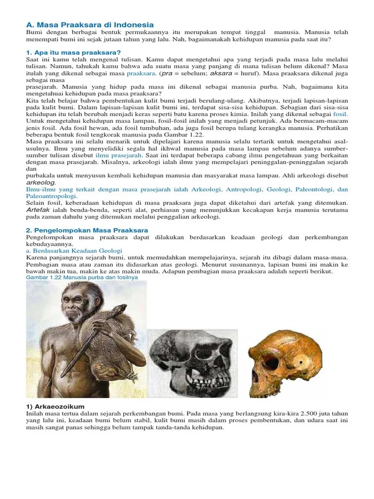 Arti penting pembelajaran tentang sejarah kehidupan zaman praaksara adalah. • kehidupan manusia masa itu dapat diketahui. Keadaan bumi masih labil, dan kulit bumi juga sedang dalam proses pembentukan. Permukaan bumi masih jauh dari stabil sehingga tidak ada . Pembagian masa praaksara berdasarkan geologi.